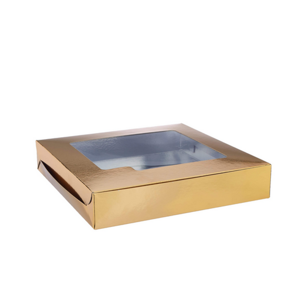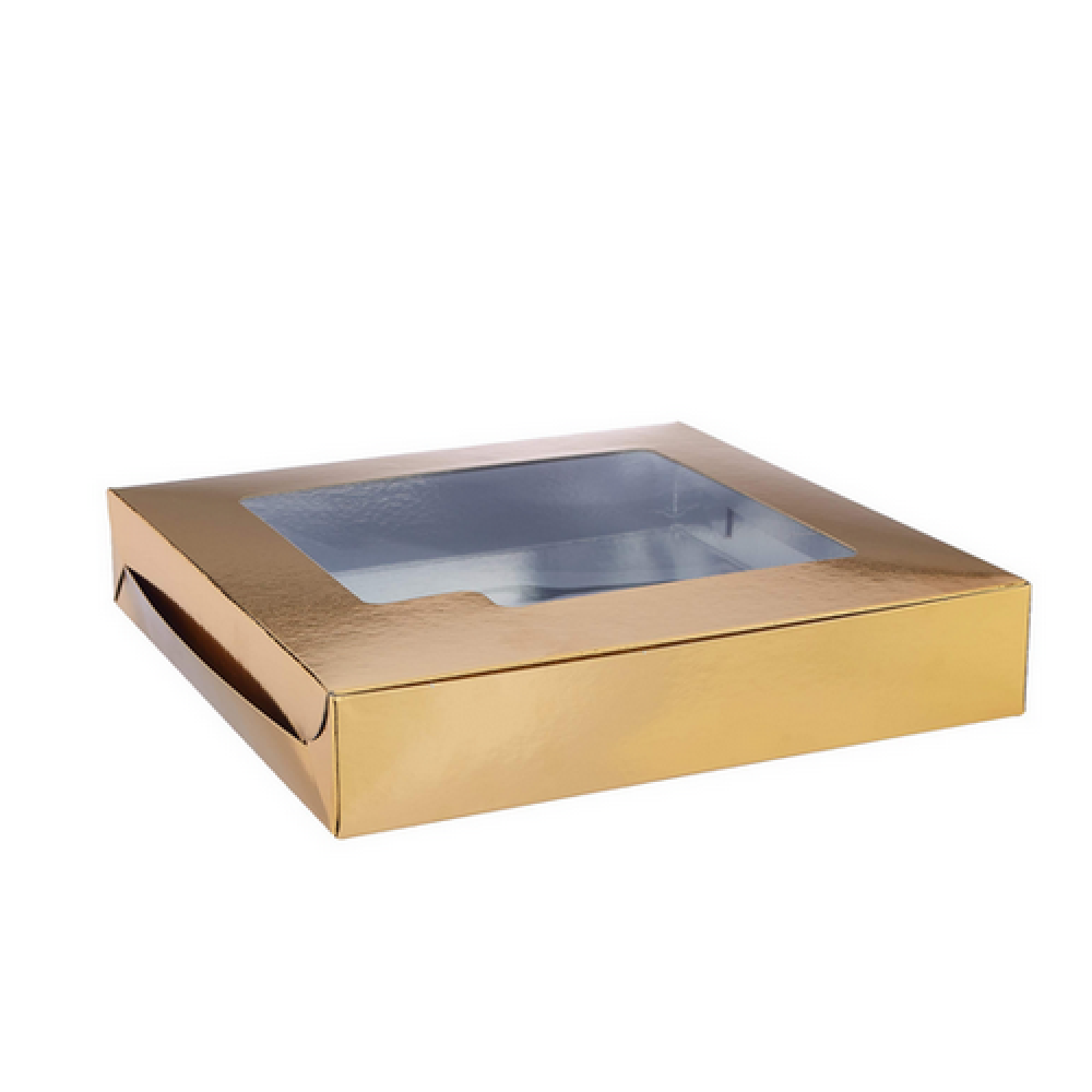 Square paper box with insulating layer and window, gold color, various sizes (50 pieces)